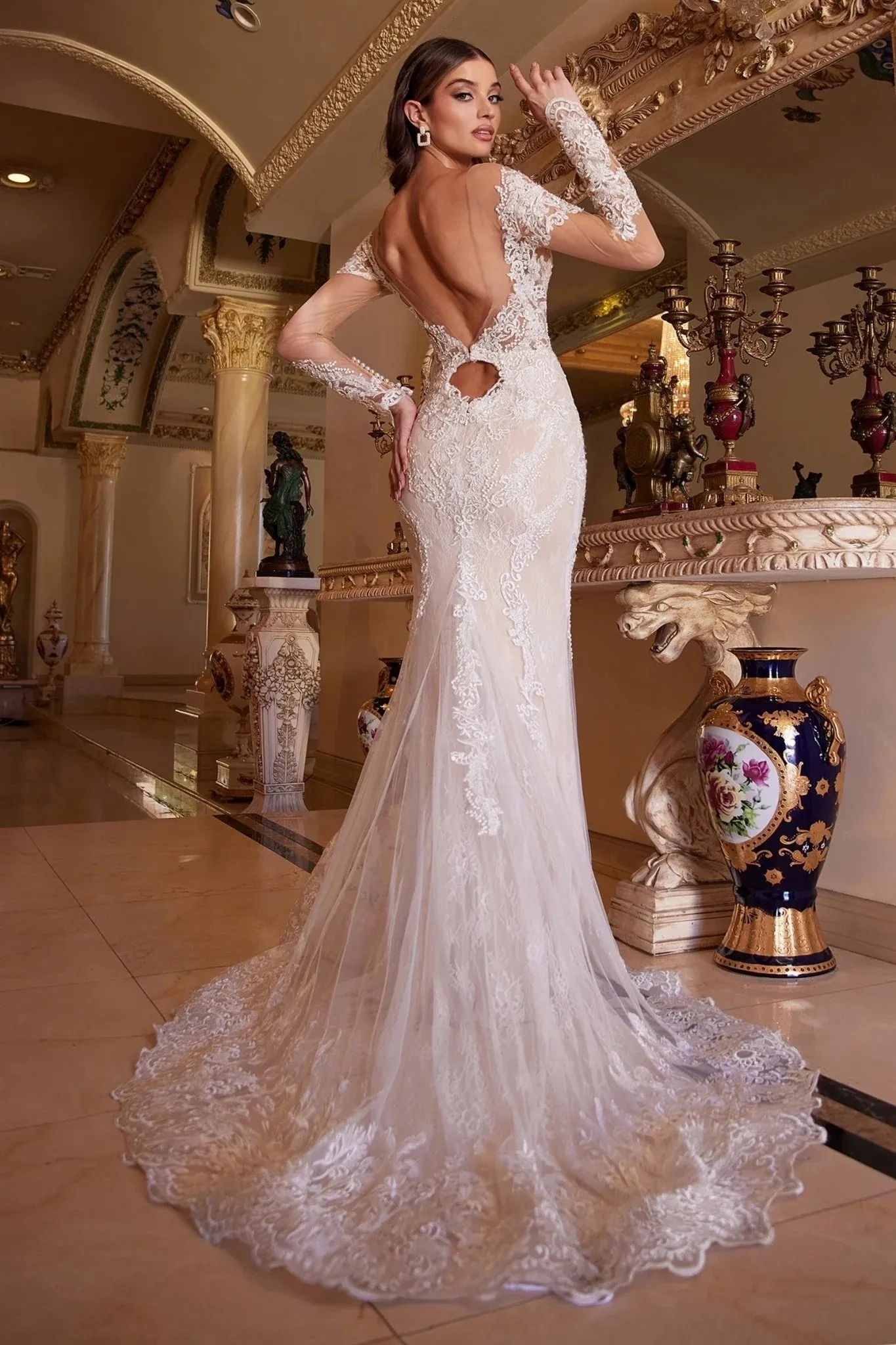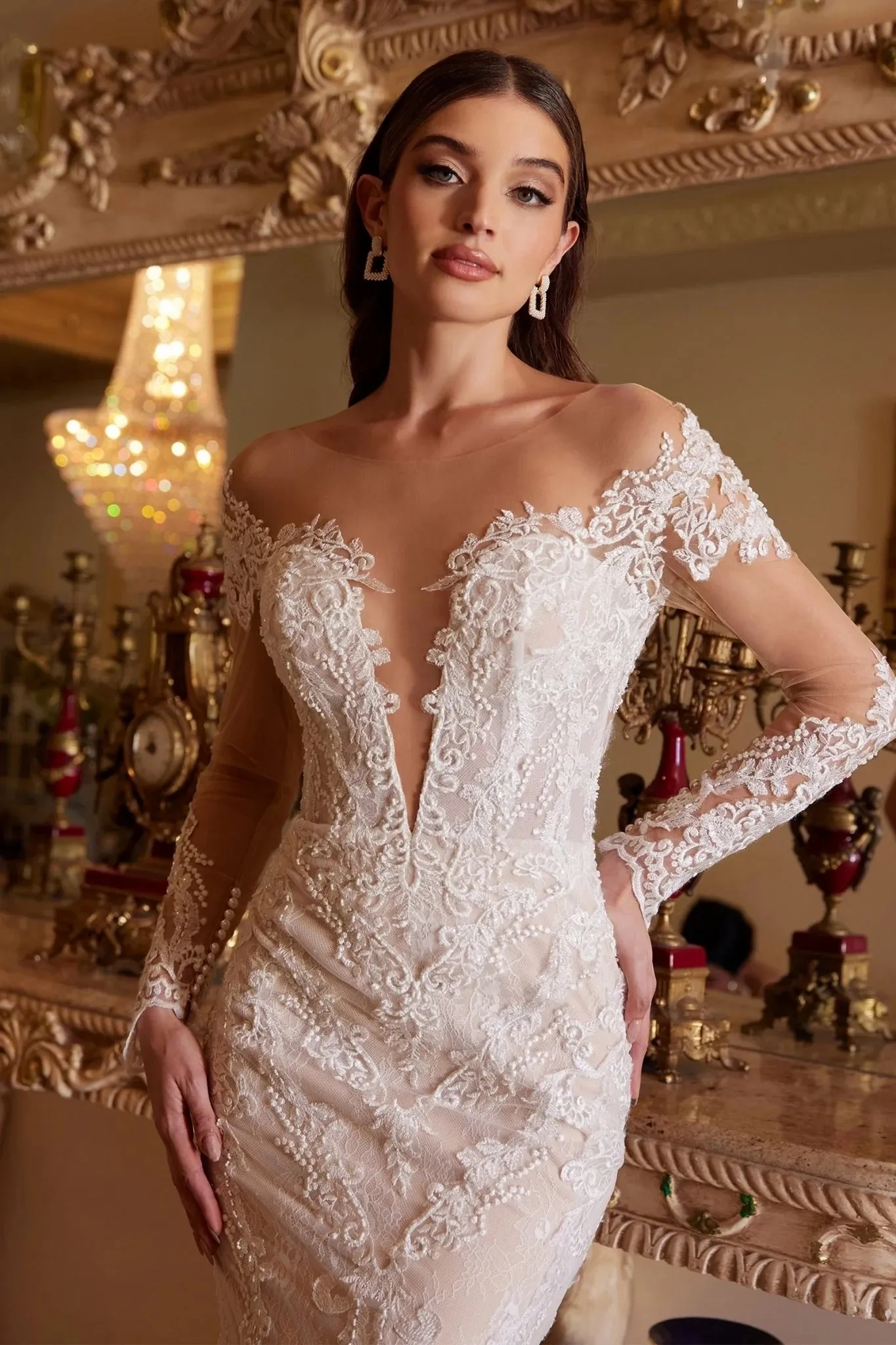 This fit & flare wedding gown highlights a dramatic plunging V-neckline framed by intricate floral lace appliqués that contour the bodice and extend seamlessly through the skirt. An illusion overlay adds depth and structure, creating a sculpted, figure-enhancing look. The gown features sheer lace sleeves, a striking open back detail, and a fitted skirt that flows into a delicate chapel-length train for a refined yet alluring finish. A timeless choice for the bride seeking elegance with a touch of bold romance. Key Features: Silhouette: Fitted Design: Plunging V-neckline with illusion detailing, sheer lace sleeves & floral lace appliqués Fabric & Material: Lace appliqué over soft tulle with smooth lining Fit Detail: Structured bodice for enhanced support with zipper back closure Occasions: Ideal for weddings, bridal ceremonies, or elegant receptions