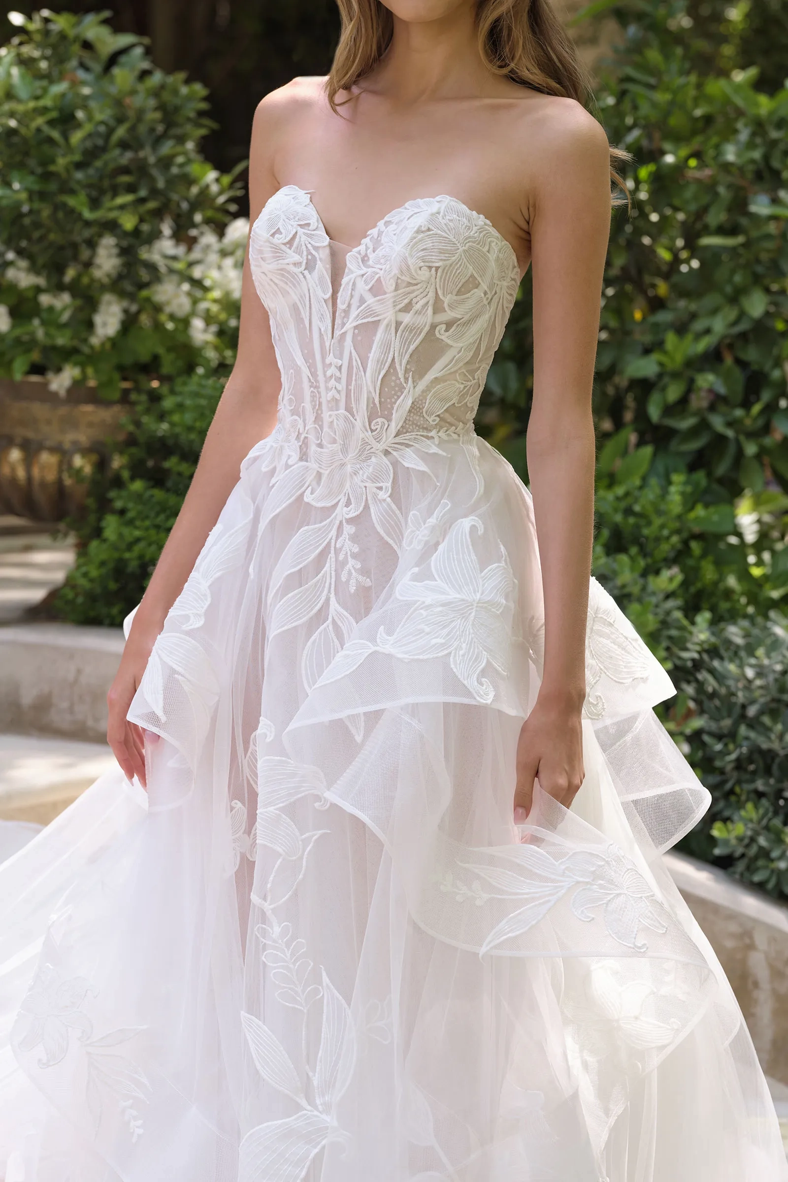 Radiating ethereal beauty, this ball gown features a strapless sweetheart neckline and a semi-sheer boned bodice that sculpts the waist with elegance. The cascading tiered tulle skirt is adorned with a delicate Star Lily floral design, creating soft volume and dreamy movement. Finished with a lace-up corset back for added structure and support, this gown is a breathtaking choice for the modern bride. Key Features: Silhouette: Ball gown Design: Strapless sweetheart neckline, sheer boned bodice bodice & tiered layered tulle skirt Fabric & Material: Star Lily floral design a top of layered tulle Fit Detail: Structured bodice & lace up corset back for enhanced support Occasions: Wedding dress or bridal gown