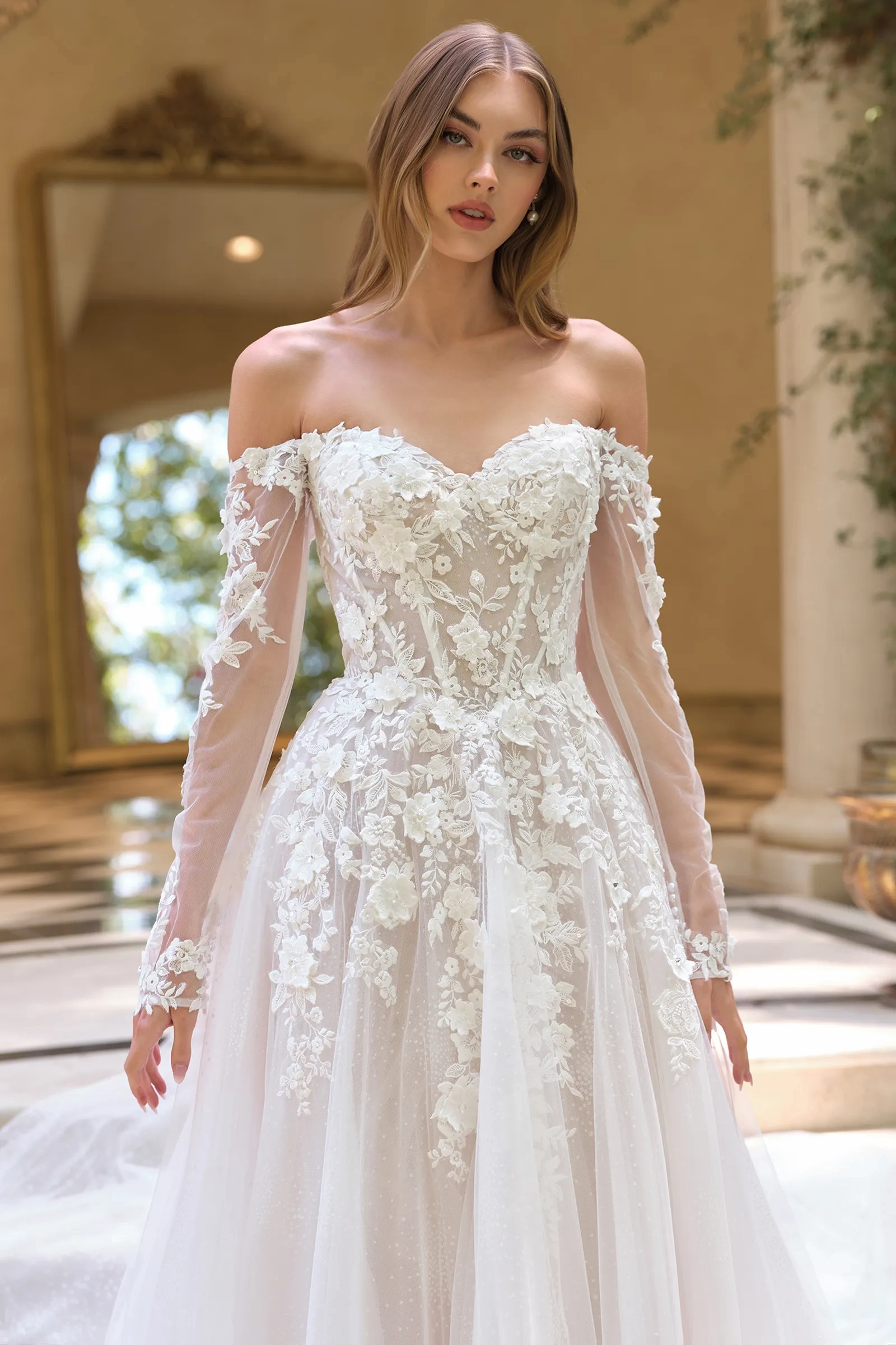 This romantic ball gown evokes fairytale elegance with its dreamy silhouette and intricate detailing. The gown features an off-the-shoulder neckline with sheer illusion sleeves and a corseted bodice adorned in hand-placed floral appliqués. Layers of glittered tulle cascade into a soft, voluminous skirt, adding shimmer and graceful movement to every step. Designed for the modern bride seeking both romance and sophistication, this gown blends timeless charm with delicate couture accents. Key Features: Silhouette: Ball gown Design: Off-the-shoulder sweetheart neckline with sheer illusion sleeves & 3D floral lace appliqué Fabric & Material: Glittered tulle skirt layered beneath lace-appliqued bodice Fit Detail: Structured corset-style bodice with boning for shape and support Occasions: Wedding gown, romantic ceremony, or bridal photoshoot