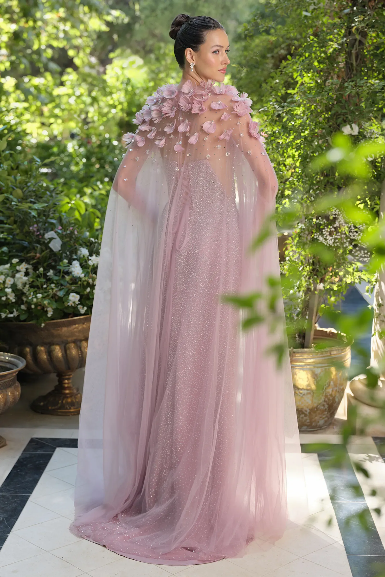 Elevate any formal look with this ethereal couture cape, crafted to add dimension, movement, and artistry to your gown. Layered sheer tulle floats effortlessly while the feathered floral appliqué creates texture and soft romantic drama. Scattered sparkle catches the light for a subtle shimmer—perfect for evening wear, galas, or aisle-worthy moments.
