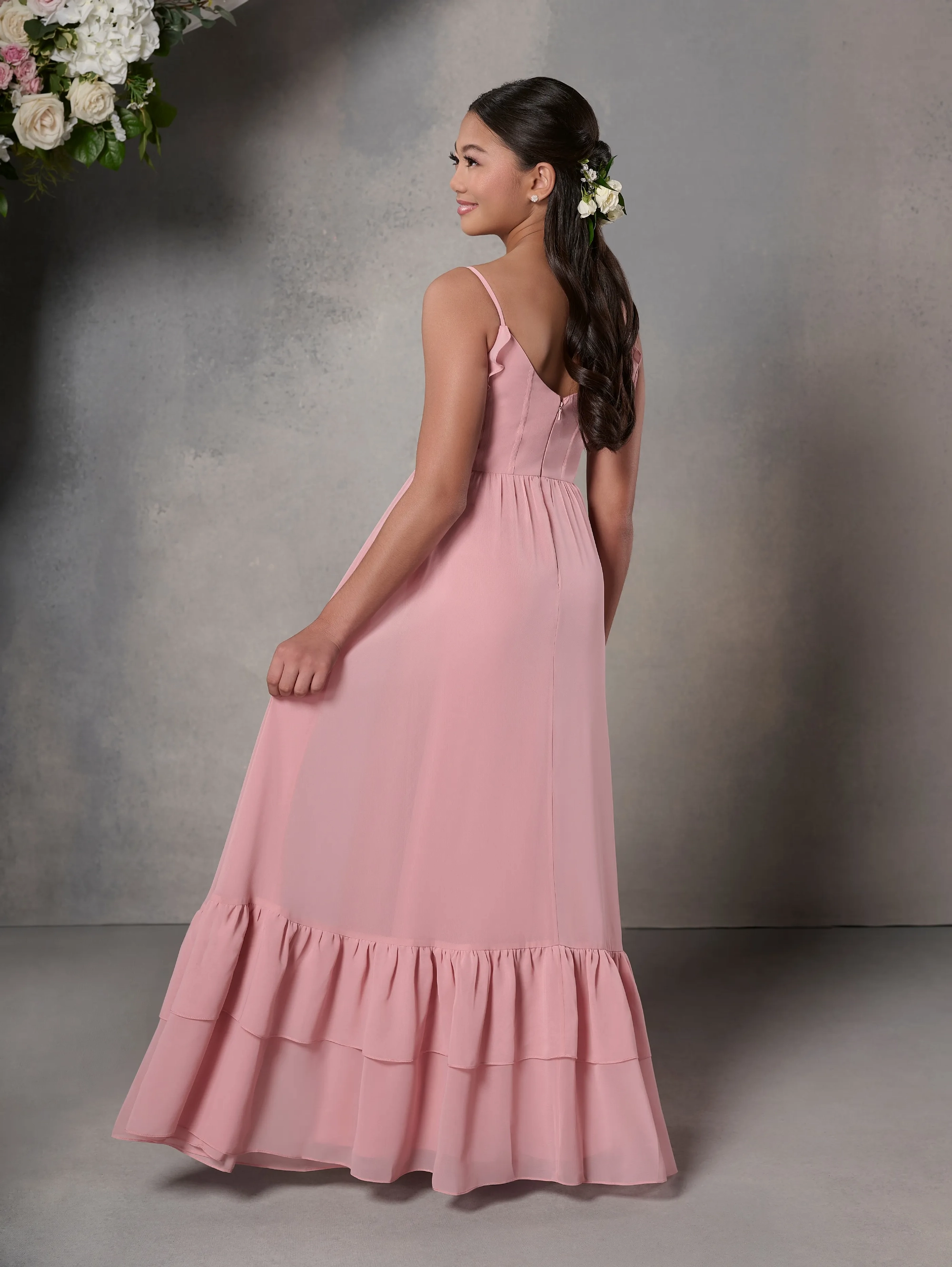 Corset bodice chiffon A-line gown with ruffle hem & off the shoulder sleeve detail.