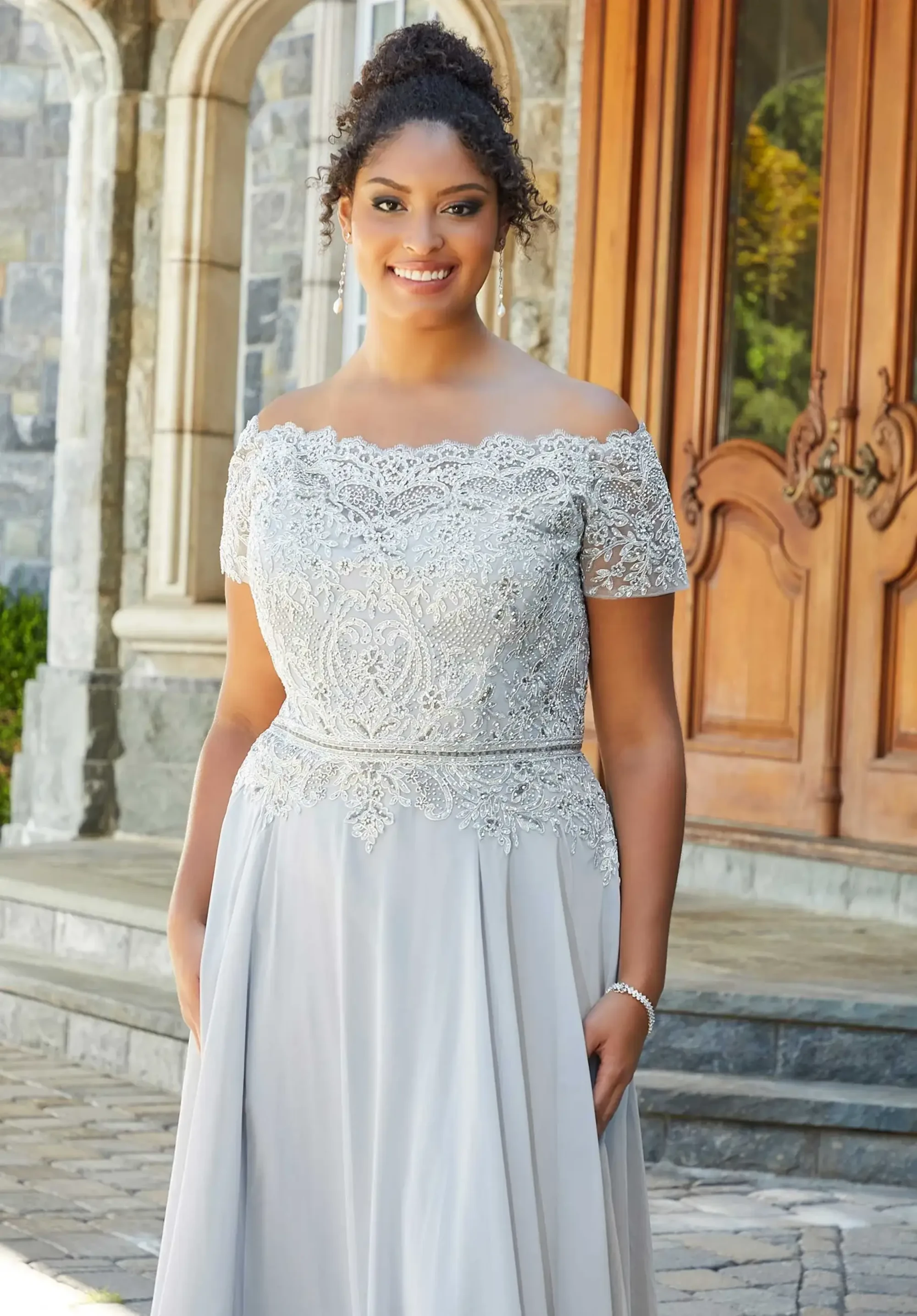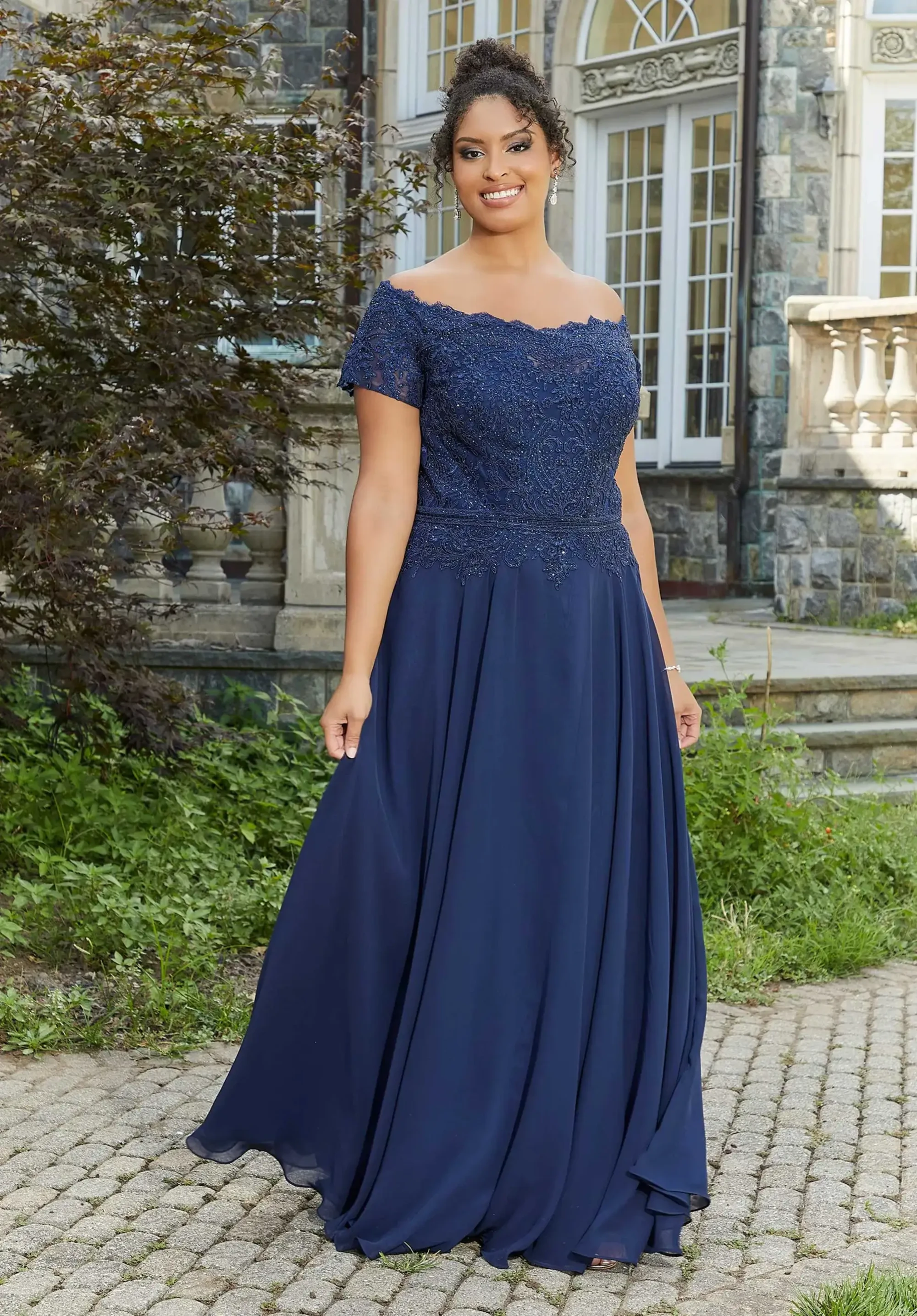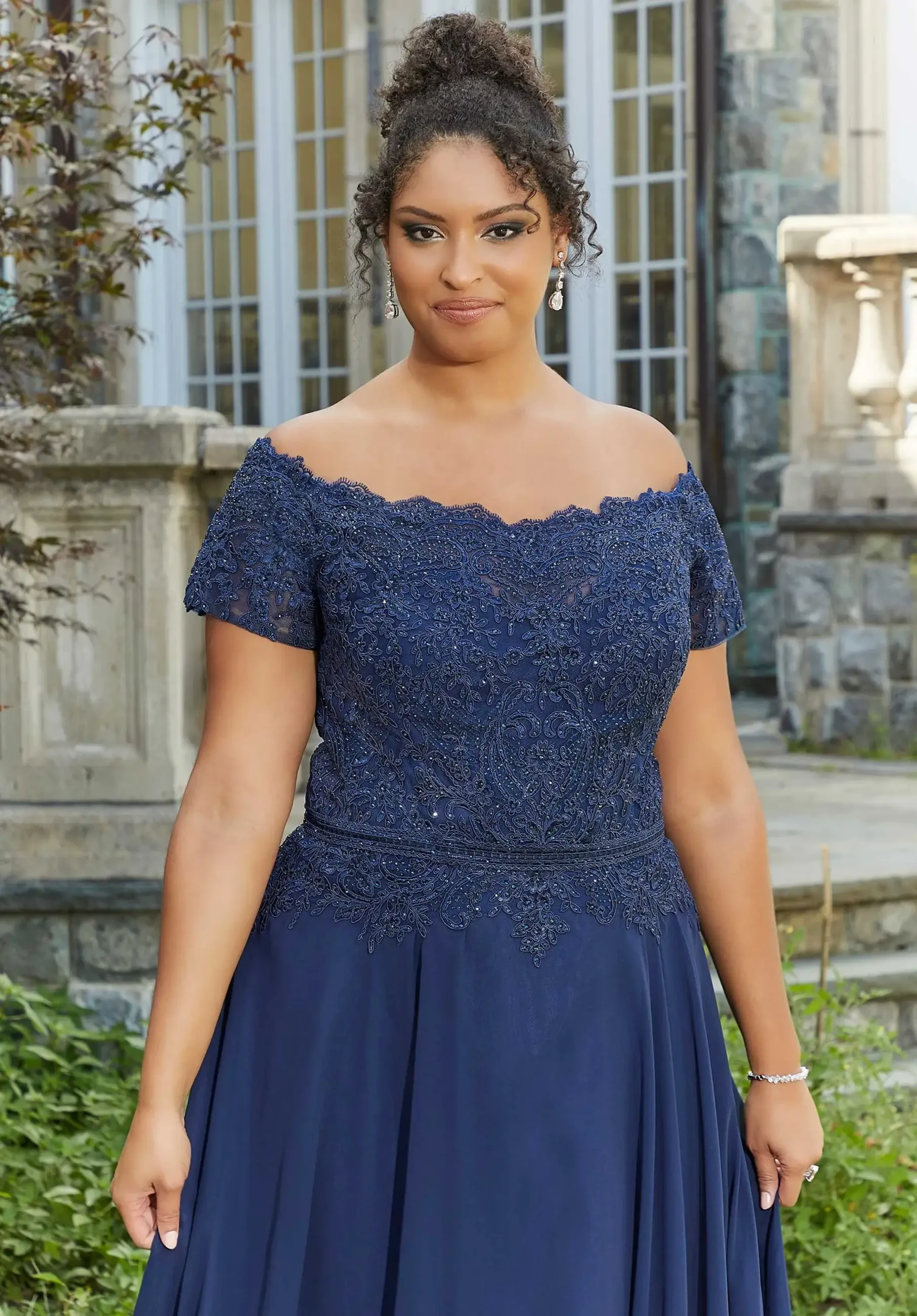 Make an entrance in this stunning style by MGNY featuring a classic off-shoulder neckline, beautiful beaded lace applique all throughout the bodice and elegant sheath silhouette. Manufacturer: MGNY Style: Sheath Neckline: Off-Shoulder Size Range: 2-26 Closure: Zipper Fabric Type: Chiffon Care Instructions: Dry Clean IMPORTANT NOTE: This item arrives with a return tag attached and instructions for removal. Once the tag is removed from the dress, this item cannot be returned.