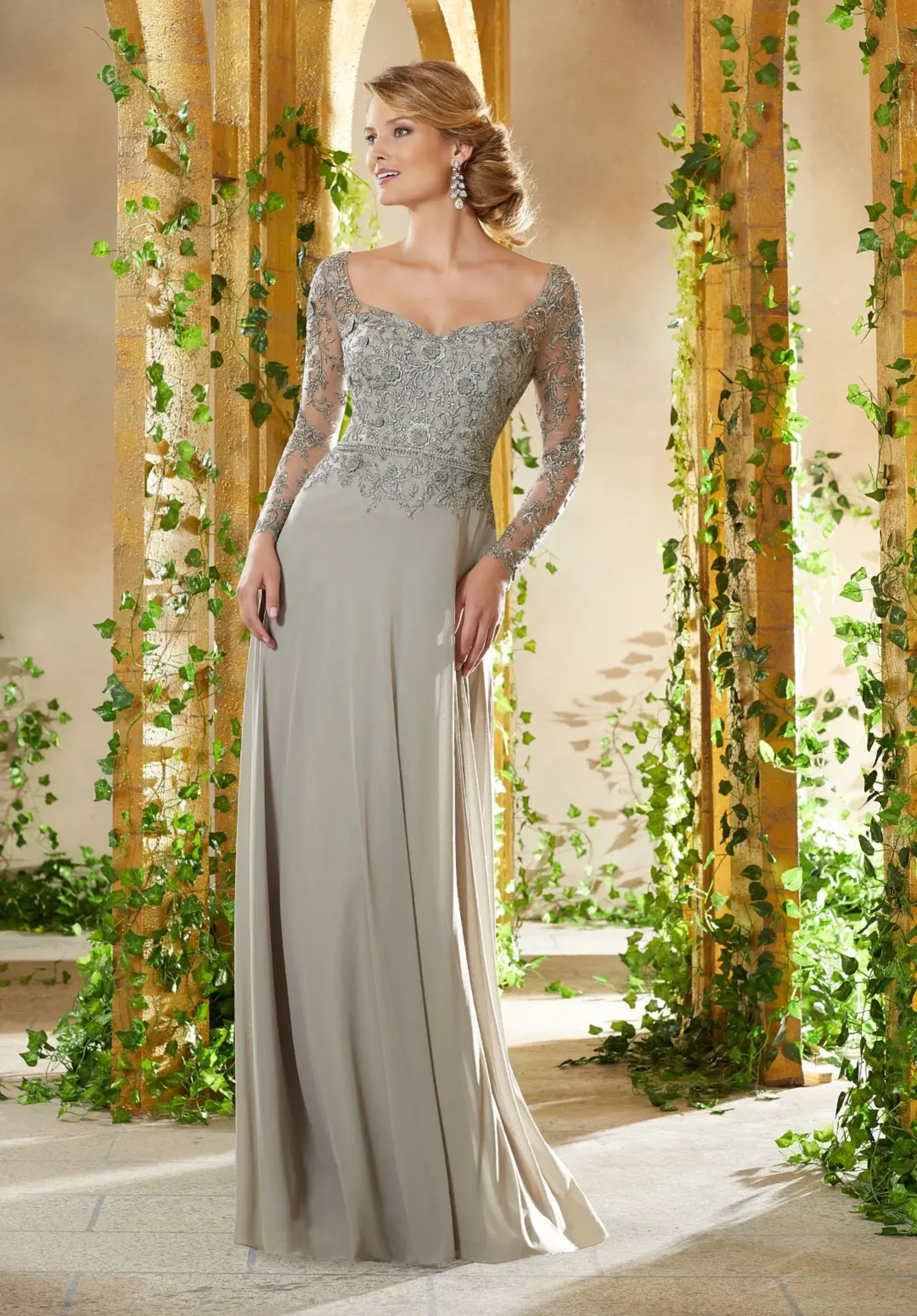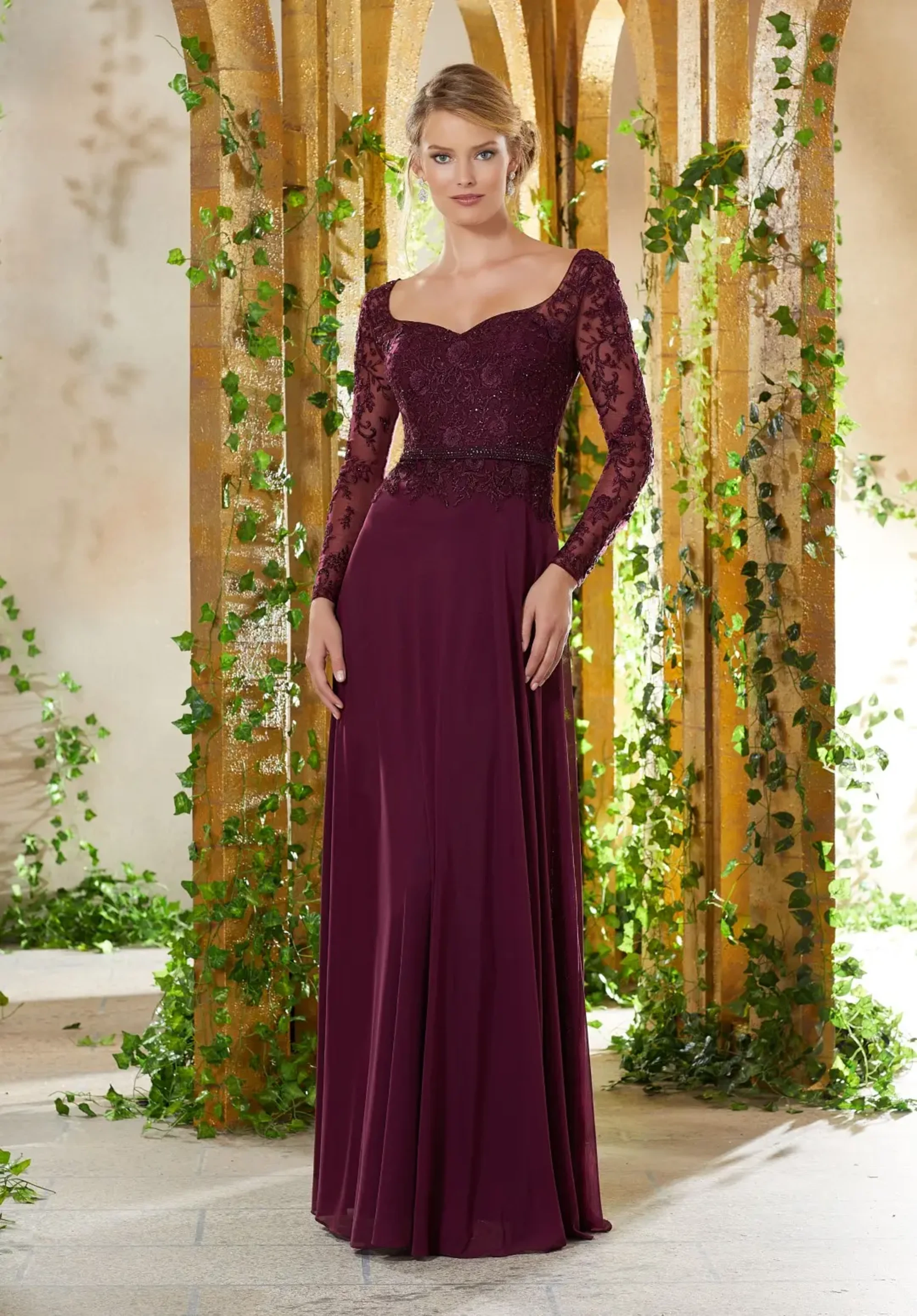 Make an entrance in this Madeline Gardner New York gown, featuring a classic scoop neckline, intricate embroidery on the bodice and long sleeves, bead detail on the natural waist, and stunning a-line silhouette. Manufacturer: Mori Lee Style: A-Line Neckline: Scoop Size Range: 10-18 Closure: Zipper; Hook & eye Fabric Type: Chiffon; Lace Care Instructions: Dry Clean IMPORTANT NOTE: This item arrives with a return tag attached and instructions for removal. Once the tag is removed from the dress, this item cannot be returned.