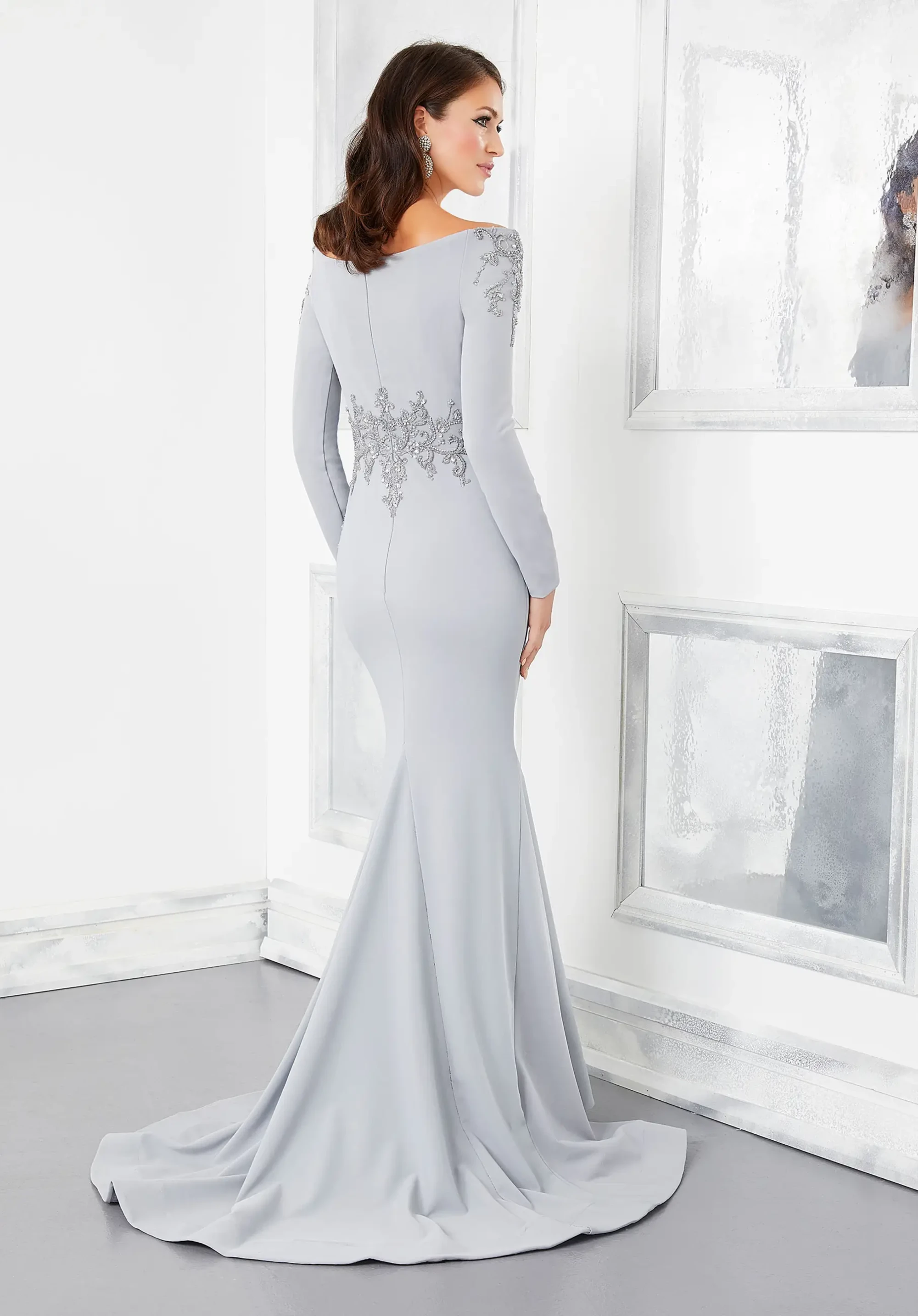 Dance the night away in this beautiful style by Mori Lee, featuring a classic off the shoulder neckline, dazzling glitter detail, and stunning sheath silhouette. Manufacturer: Mori Lee Style: Sheath Neckline: Off The Shoulder Size Range: 00-16 Closure: Zipper; Hook & eye Fabric Type: Jersey Care Instructions: Dry Clean IMPORTANT NOTE: This item arrives with a return tag attached and instructions for removal. Once the tag is removed from the dress, this item cannot be returned.