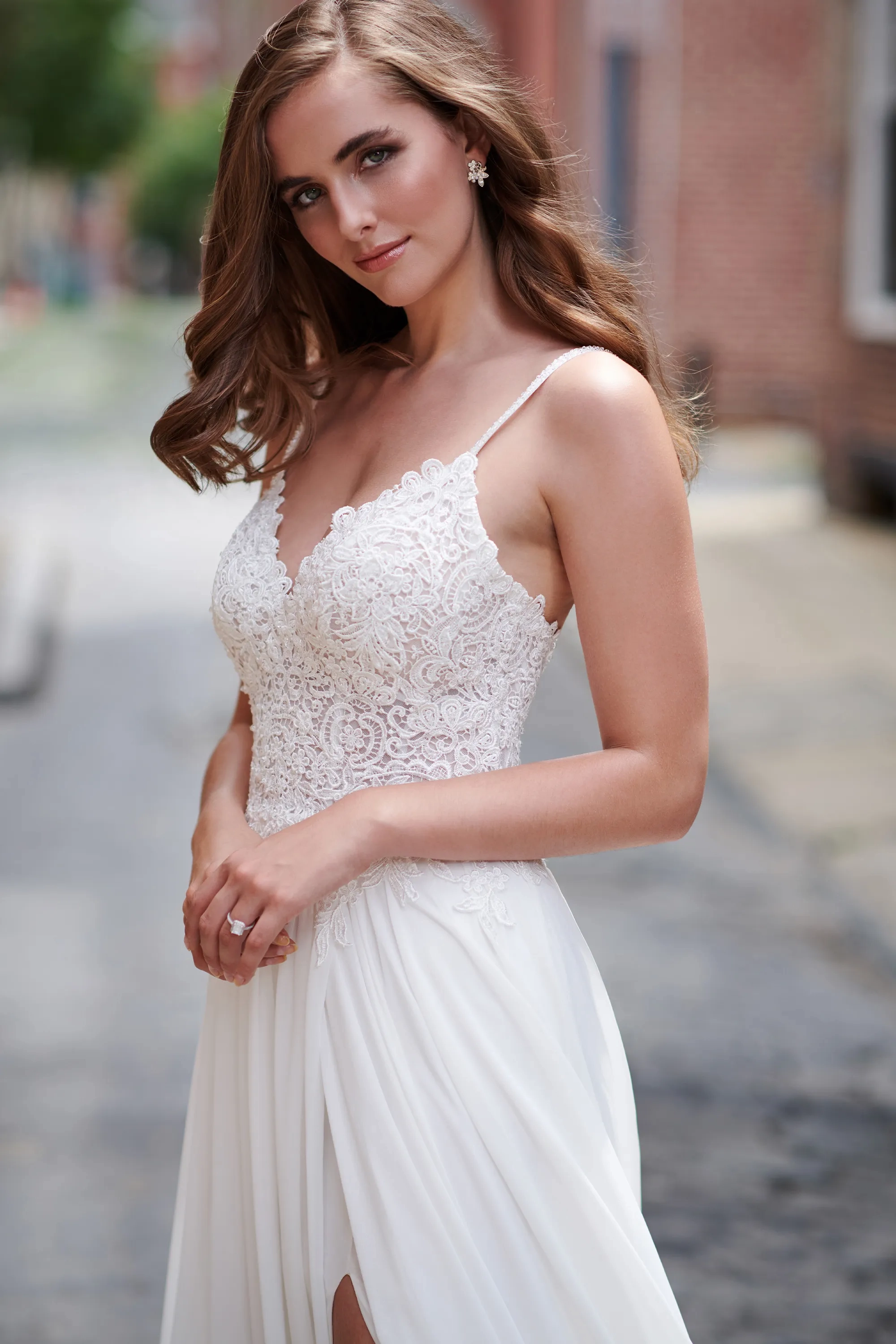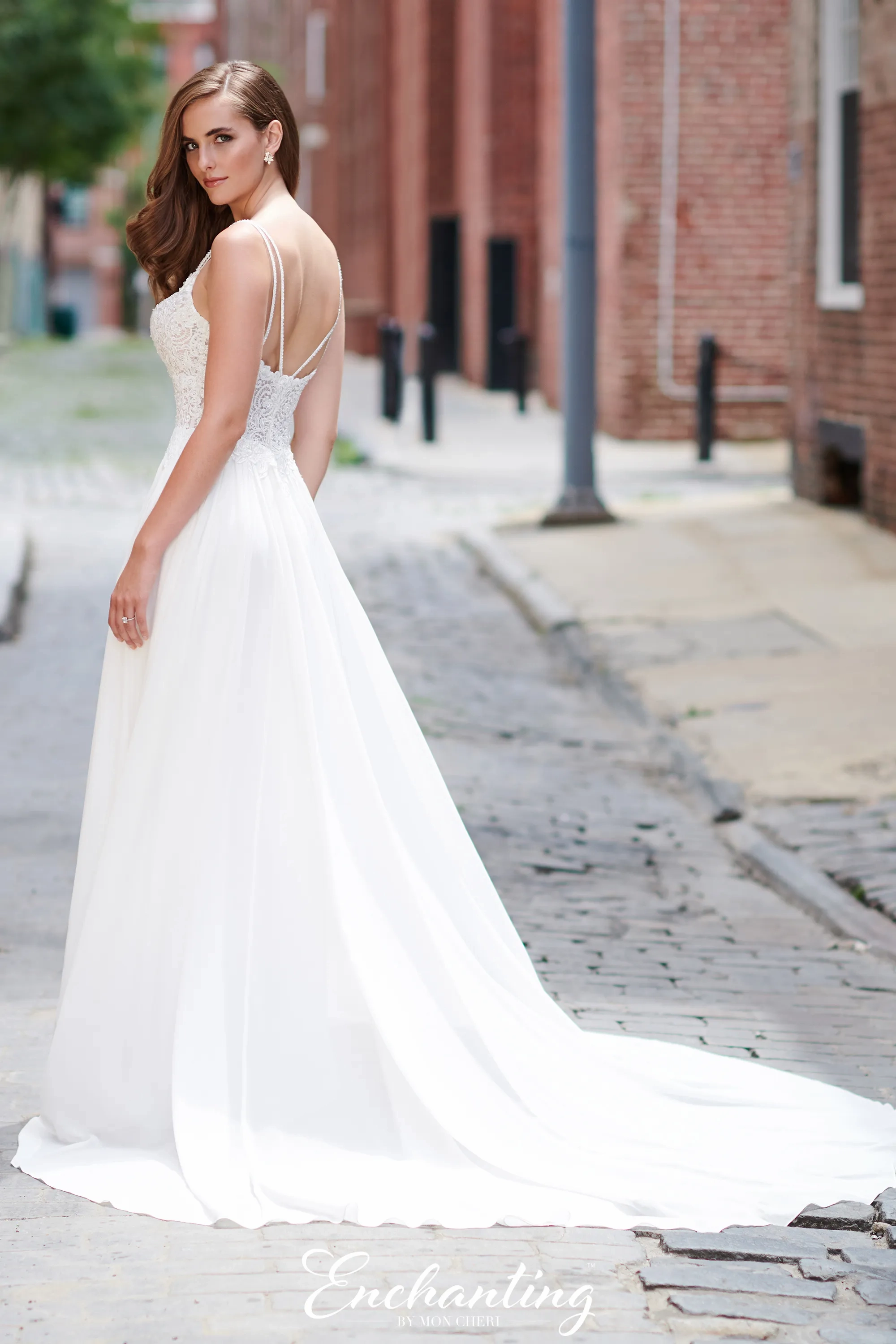Say 'I do" in this stunning gown by Mon Cheri featuring a classic v-neckline, elegant sheer lace bodice, intricate beaded twin straps, bare low back and stunning A-Line silhouette introducing a sultry side slit. Manufacturer: Mon Cheri Style: A-Line Neckline: V-Neck Size Range: 0-26W Closure: Zipper Fabric Type: Chiffon; Lace Care Instructions: Dry Clean IMPORTANT NOTE: This item arrives with a return tag attached and instructions for removal. Once the tag is removed from the dress, this item cannot be returned.